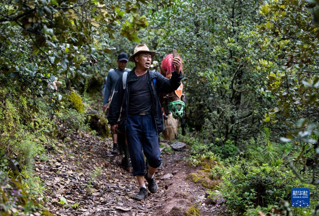 泸沽湖马帮队队长杨直之一边牵着马一边唱着山歌录视频(9月1日摄)。