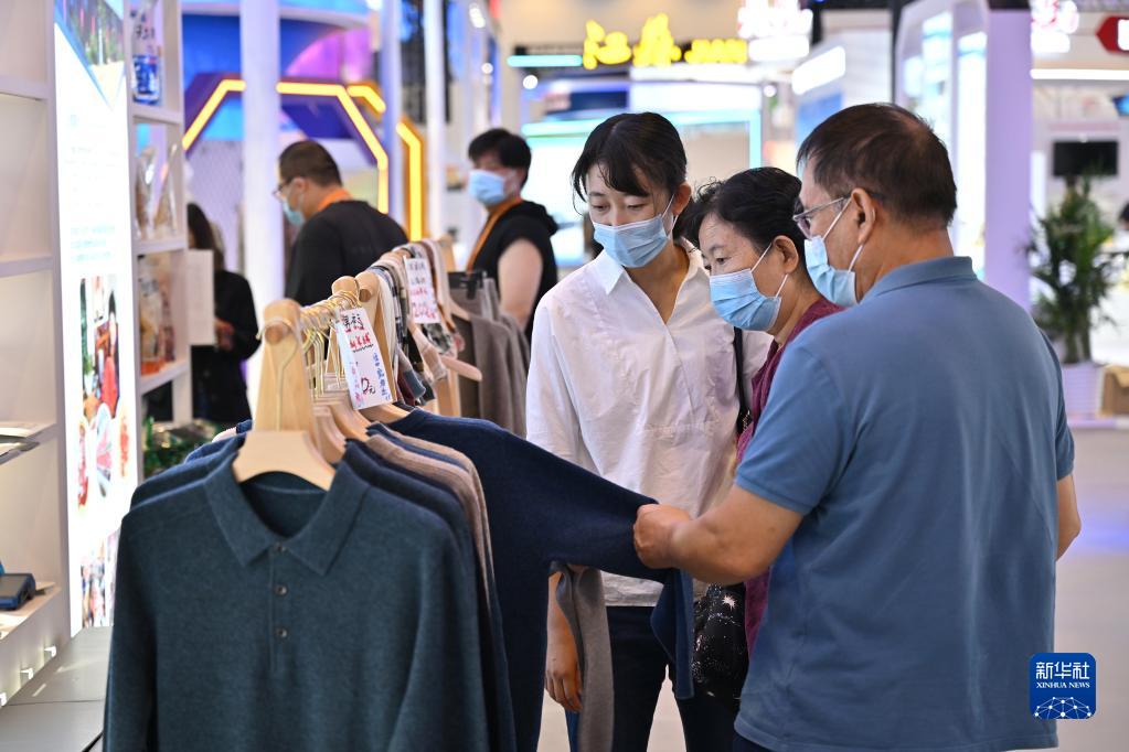 9月3日,观众在服贸会内蒙古展台选购羊绒衫。
