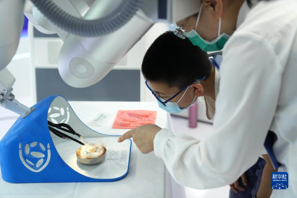 9月3日,观众在首钢园区观看一款手术机器人演示。