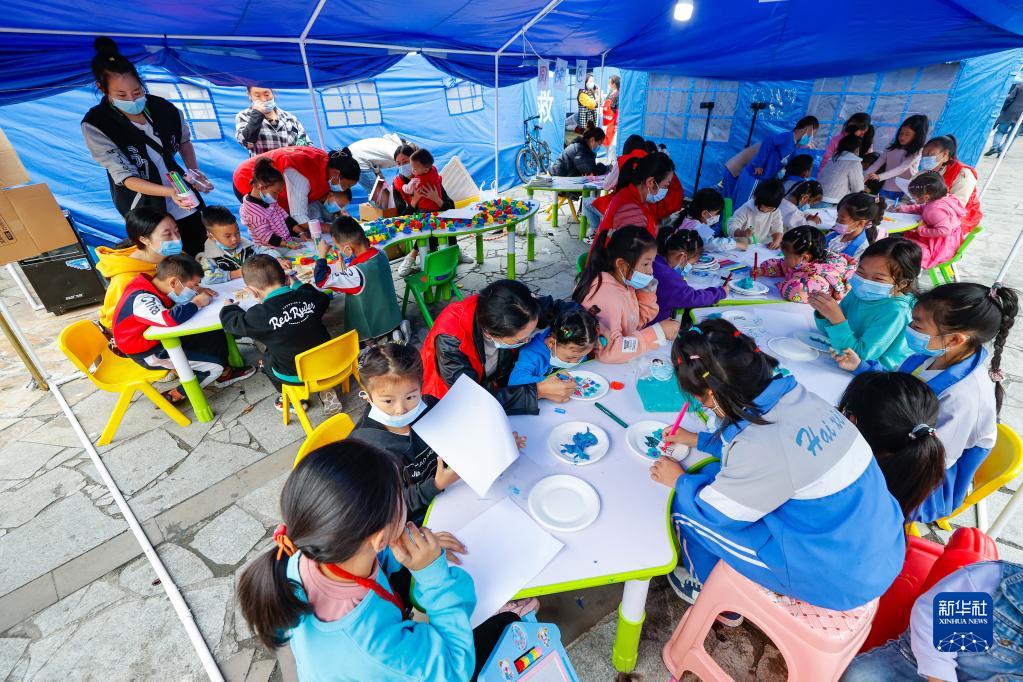 9月7日,在四川省甘孜州泸定县磨西镇地震救灾安置点,志愿者陪伴孩子们在青青儿童乐园做手工、玩玩具。