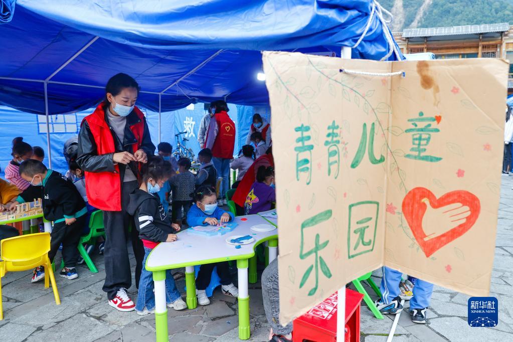 9月6日,四川省甘孜州泸定县磨西镇在地震救灾安置点里开设了一个青青儿童乐园,通过做游戏等方式对这里的孩子进行安抚。此后还将有更多青青儿童乐园在安置点里陆续设立。