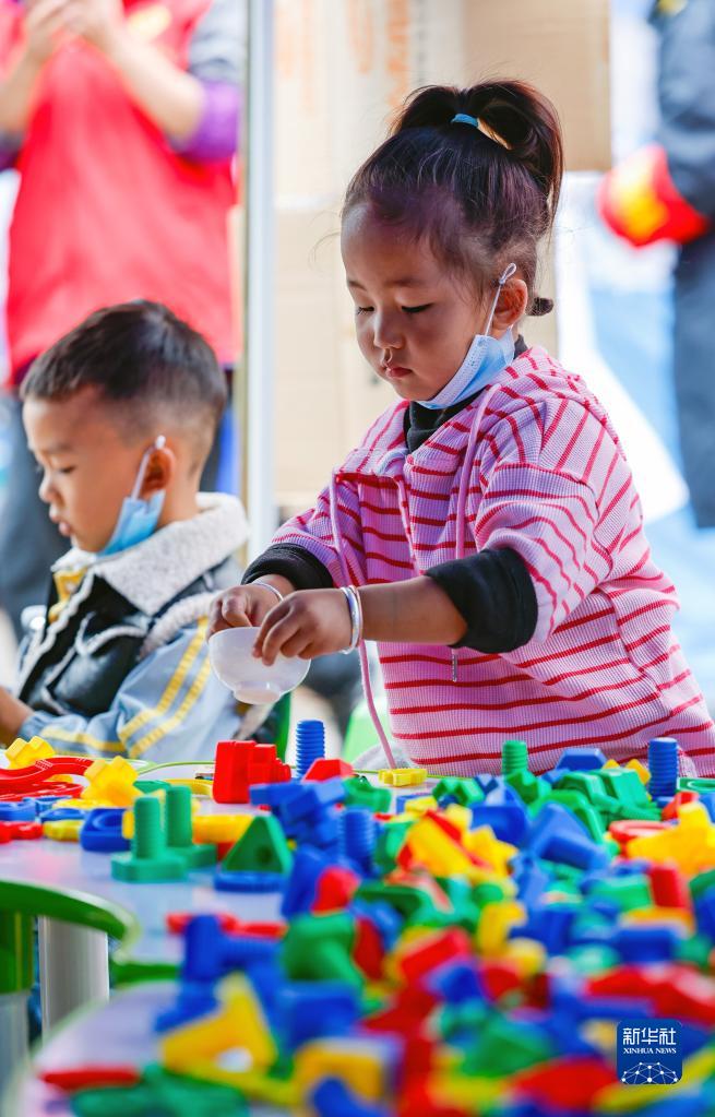 9月7日,在四川省甘孜州泸定县磨西镇地震救灾安置点,孩子们在青青儿童乐园玩玩具。