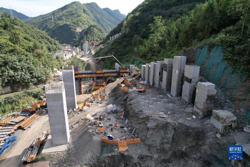建设中的西康高铁桐木车站特大桥(9月6日摄,无人机照片)。