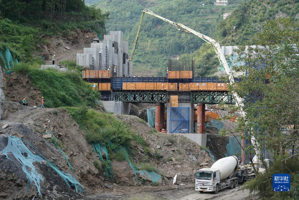建设中的西康高铁桐木车站特大桥(9月6日摄)。