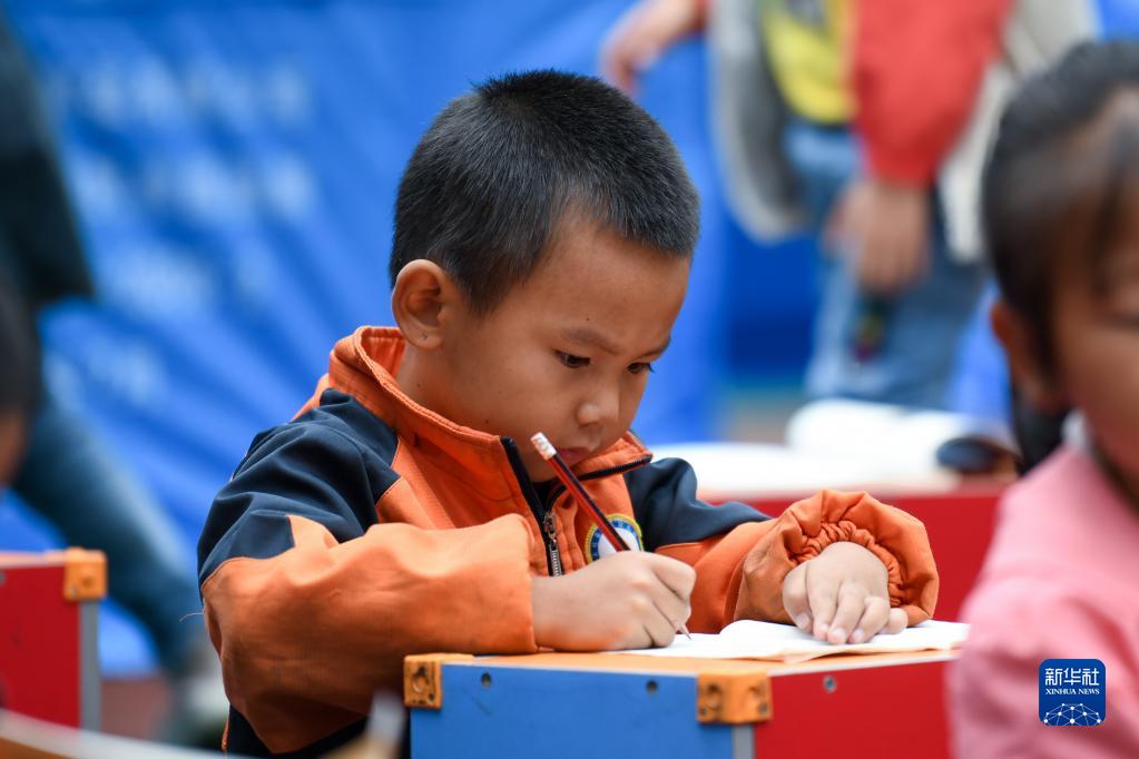 9月7日,学生在石棉县草科乡中心小学操场上做作业。