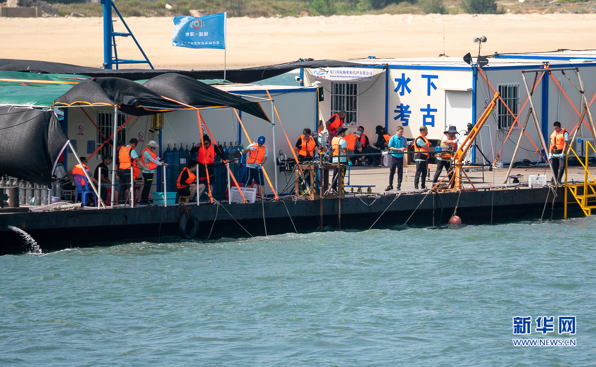 9月8日,圣杯屿海域元代海船水下考古遗址发掘现场,工作人员在海上作业平台上忙碌。新华网 肖和勇 摄