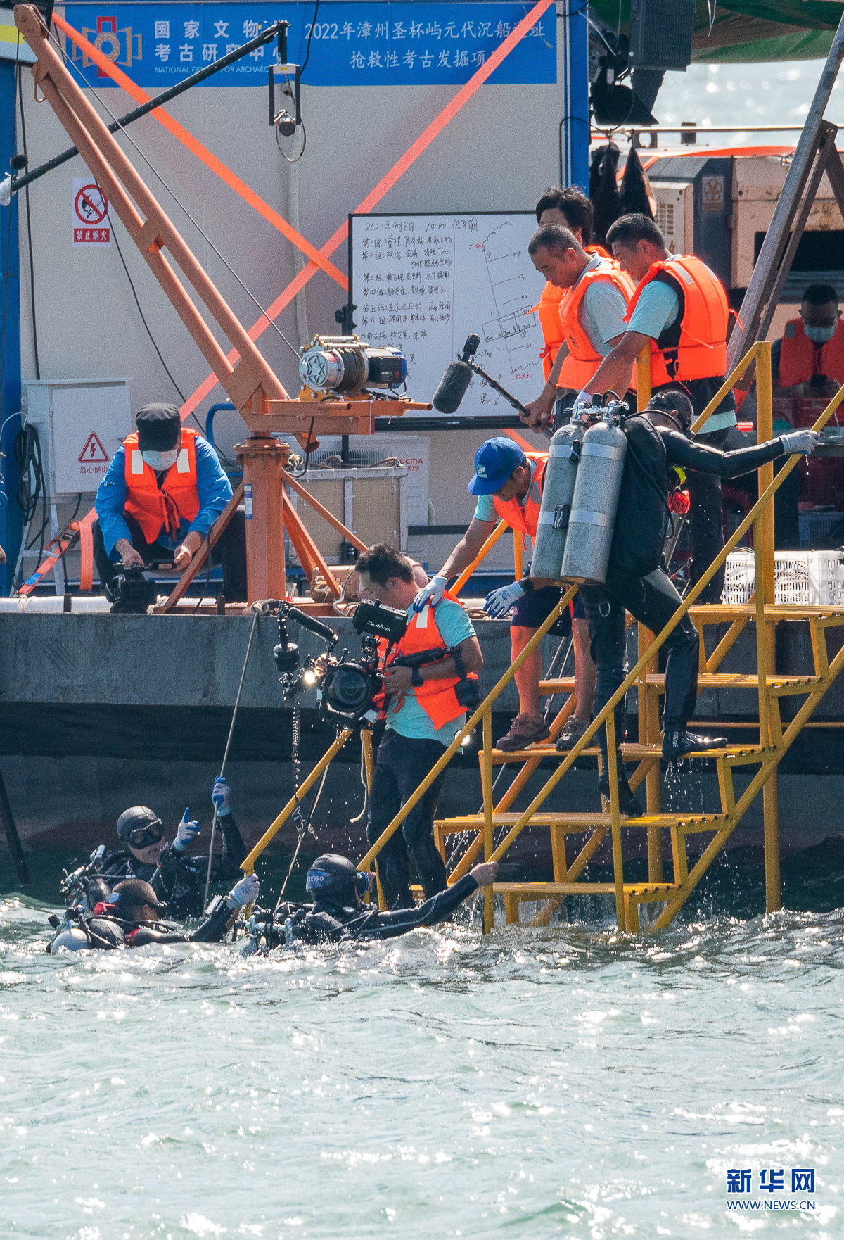 9月8日,圣杯屿海域元代海船水下考古遗址发掘现场,工作人员完成水下考古发掘作业,回到海上作业平台。新华网 肖和勇 摄