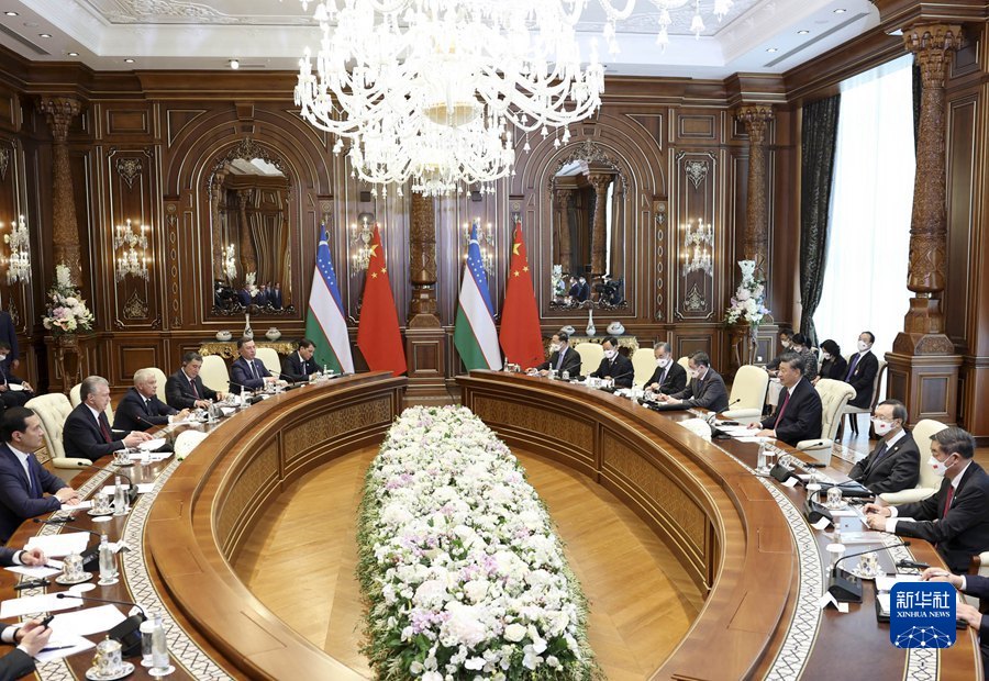 当地时间9月15日,国家主席习近平在撒马尔罕同乌兹别克斯坦总统米尔济约耶夫会谈。新华社记者 丁海涛 摄