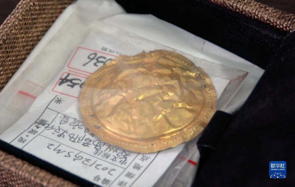 这是7月15日拍摄的郑州商城遗址高等级贵族墓M2中出土的金泡。