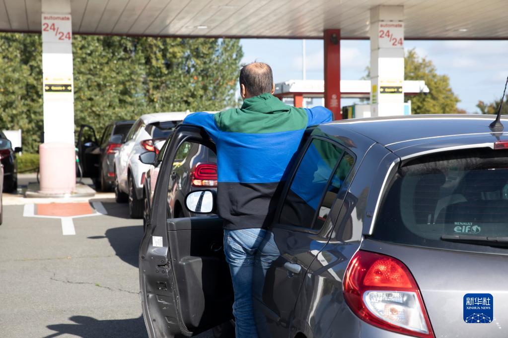 10月6日,在法国北部城市里尔,欧尚超市的加油站前车辆排起长队。近日,法国道达尔集团旗下的许多加油站因燃油供应中断而暂时关闭,导致其他加油站前排起长龙。