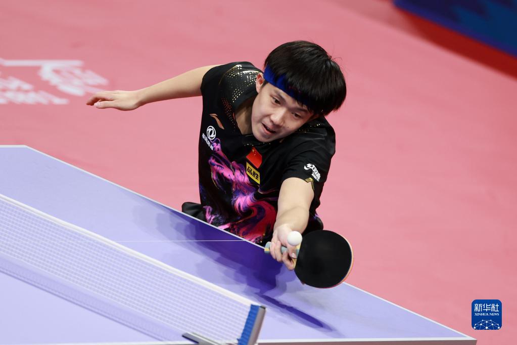 10月9日,中国队选手王楚钦在比赛中回球,他以3比0战胜德国队选手凯·斯达姆珀。新华社记者 胥冰洁 摄