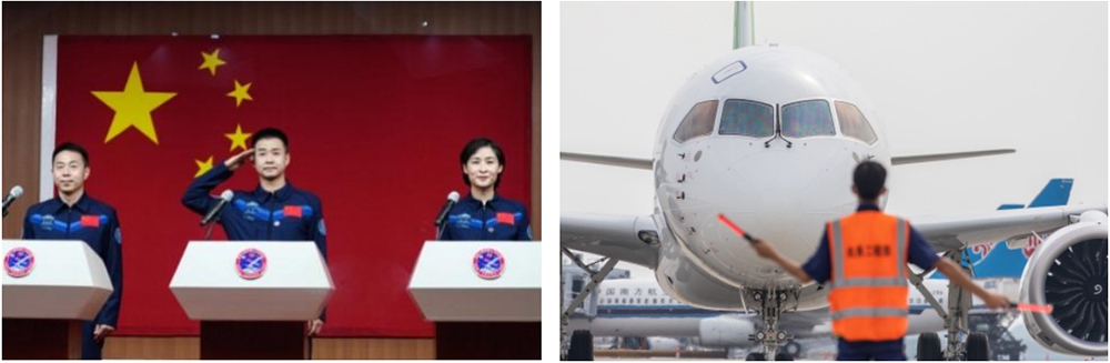 习近平总书记说,发展航天事业,建设航天强国,是我们不懈努力追求的航天梦。十八大以来中国航天坚定道路自信,把科技自立自强作为航天事业发展的战略支撑,在核心关键领域实现密集突破。宿东的作品《神舟十四号出征太空(组照)》表现的是,2022年6月5日10时44分神舟十四号载人飞船升空,成功将载有陈冬、刘洋、蔡旭哲三名航天员送入预定轨道,标志着我国航天事业跨入世界最先进的行列。陈松的作品《国产大飞机翱翔蓝天(组照)》中,C919大型客机是我国按照国际民航规章自行研制、具有自主知识产权的大型喷气式民用飞机,2022年5月14日中国商飞公司交付的首架C919大飞机飞行试验圆满完成,把我国民用航空事业推向新的高度,预示着大飞机国产化时代即将开启,将彻底打破西方垄断制约的航天格局。