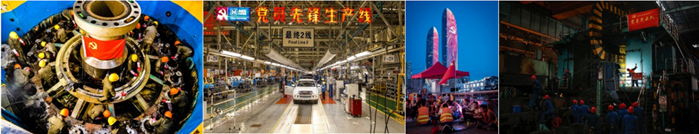中国共产党是通过党的基层组织和全体党员的共产主义理想和中国特色社会主义信念,胸怀全局、心系群众,奋发进取、开拓创新,立足岗位、无私奉献,充分发挥战斗堡垒和先锋模范作用,带领广大群众共同实现党的纲领和路线,不断为社会主义现代化建设做出贡献。展览中有一组作品,表现的是党员在最艰苦、最困难的工作中,形成合力,迸发出巨大的能量,在完成急难险重的任务中勇于担当。常飞的《党旗在我心中》就是聚集了党的基层组织建设所释放的能量的优秀作品,充分表现出有了组织的凝聚力,就有我们的战斗力,就能发挥好党员先锋模范作用。机器维修现场,党旗融入到每一位党员心中,大家齐心协力,攻关克难完成抢修任务。万苏平的《党员先锋生产线(组照)》作品突出了党员先锋队的作用,无论在任何地方,只要共产党员发挥先锋模范作用,就一定能把工作干得最好。王亚峰的作品《关键时刻》共产党员突击队冲锋在前,他们的口号是“困难面前有党员,党员面前没困难”,在他们面前没有克服不了的困难,没有完不成的任务。杨金木的《幸福都是奋斗出来的》展示的是,入夜了,高耸入云的楼塔上,灯光绣出闪光的党徽,飘动的国旗下,在工地上工人们风餐露宿、加班加点工作。湛蓝的夜空,火红的国旗和灯光底色,桔黄衣着的工人师傅,构成绚丽多彩的未来:幸福是靠奋斗出来的!