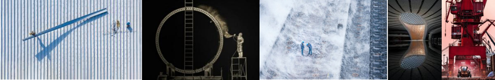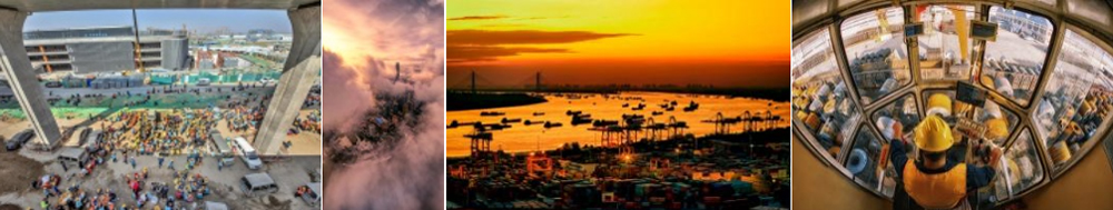 这十年,中国铁路、公路增加里程约110万公里,相当于绕行地球赤道27圈半。深中通道项目全长约24公里,是世界级的“桥、岛、隧、地下互通”集群工程,为国家确定建设的重大交通基础设施项目,是大湾区建设关健性工程,李晓群的《超级工程——建设中的深中通道(组照)》让我们有了更直观的了解。黄蕾的《金龙飞越杨泗港(组照)》是一件内容和形式统一的好作品,武汉杨泗港长江大桥的主色调为“金秋黄”,代表着硕果累累,与橘红色的鹦鹉洲长江大桥、海灰色的武汉长江大桥等桥梁交相辉映,极大地丰富了武汉桥都“桥梁博物馆”的内涵。罗京新的《海上“工匠”天堑架飞虹(组照)》所拍摄的平潭海峡公铁两用大桥,建成后成为我国首座公铁两用跨海大桥,也是世界上最长的跨海峡公铁两用大桥。作为规划中的北京至台湾高铁的重要部分,它是一座万众瞩目的大桥,创下多个世界之最,被誉为施工难度最大的桥梁之一。余胜亲的《摩天勇士(组照)》跟踪记录了武汉绿地中心的“摩天鲁班”们在500多米的高空建造高楼的震撼场景,彰显了新时代“摩天勇士”们为城市建设做出的卓越贡献。朱莉的《云蒸霞蔚(组照)》航拍上海黄浦江两岸,这是中国城市建设的微缩,现代化的国际大都市犹如神话般若隐若现,十分靓眼。高嵩的《工地印象(组照)》展示的是北京大兴国际新机场的工地,辛勤忙碌的建筑工人们围在一起午餐、午休场景,构成了独特的一道风景线。在翟亚平的《繁忙的港口》中,桔红的霞光与江水映成一片,展现了港口码头的全景,繁忙的港口转运到各地的货物。张亚楠的《观览大局》中,码头的龙门吊驾驶室内,作者用超大广角镜头拍摄了工人在操作吊装货物。