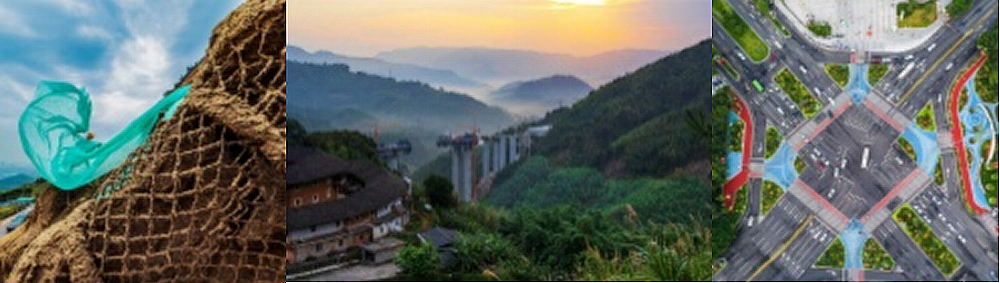 我国持续加大对自然生态系统和环境的保护力度,加强生态文明制度建设,正确处理发展与环境的辩证关系,努力实现绿色环保发展,从葛世卿的《草方格治沙(组照)》、李军的《治沙造林保家园(组照)》中不难看出。草方格治沙是宁夏中卫独特的治沙方法,经过几代人的努力,创造了“人进沙退”的治沙奇迹,治沙成果受到联合国环境规划署的肯定,获得“全球环境保护500佳”称号和国家科技进步特等奖。石羊河流域下游,东北部河西走廊的民勤县,东西北三面被腾格里和巴丹吉林两大沙漠包围,属全国防沙治沙重点区域,他们坚持生态优先、绿色发展,不断加大防沙治沙和造林绿化力度,秉承“勤朴坚韧、众志成城、筑牢屏障、永保绿洲”防沙治沙精神,阻隔两大沙漠合拢。全县人工造林保存面积达到230万亩以上,其中压沙造林103万亩以上,封育天然沙生植被325万亩以上,在408公里的风沙线上建成长达300多公里的防护林带,森林覆盖率由上世纪50年代的3%提高到如今的18.28%,草原植被盖度达到18.65%。吴克《一生追求(组照)》作品中的石宗宏是安徽山村村民,自2001年从乡村教师岗位退休后,在荒山上种植树木400余亩,并带领山村群众十余年绿化荒山3000多亩,被评为“中国好人”。敖云的《复绿在行动(组照)》表现的是护坡工人攀爬于山峦沟壑,为裸露的土坡披上保护层,如同在大地上铺上壮阔的舞台幕布。这是劳动者的艺术,亦是充满宏观美感的艺术劳动。今天,我国森林覆盖率从新中国成立之初的8.6%提高到2020年的23.04%,“绿水青山就是金山银山”的生态文明建设理念深入人心,不断以经济发展促进生态环境改善,用生态环境改善推动经济发展质量提升。刘剑颖的《高速公路修进南靖土楼》表现的是解决世界文化遗产南靖土楼森林公园的经济发展与生态保护的矛盾问题,在保护生态的前提下,修建通往大山深处高速公路,将有效整合文化遗产与森林公园优质的资源,实现社会经济与生态文明的良性发展。袁立川的《“互联网”》是体现打造道路生态文明这一主题的作品,出行的安全快捷文明是经济发展、社会和谐和精神文明的体现,更是生态文明的建设内容。
