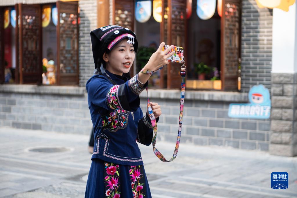 11月19日,游客在张家界大庸古城湖南首届非遗博览会现场自拍。