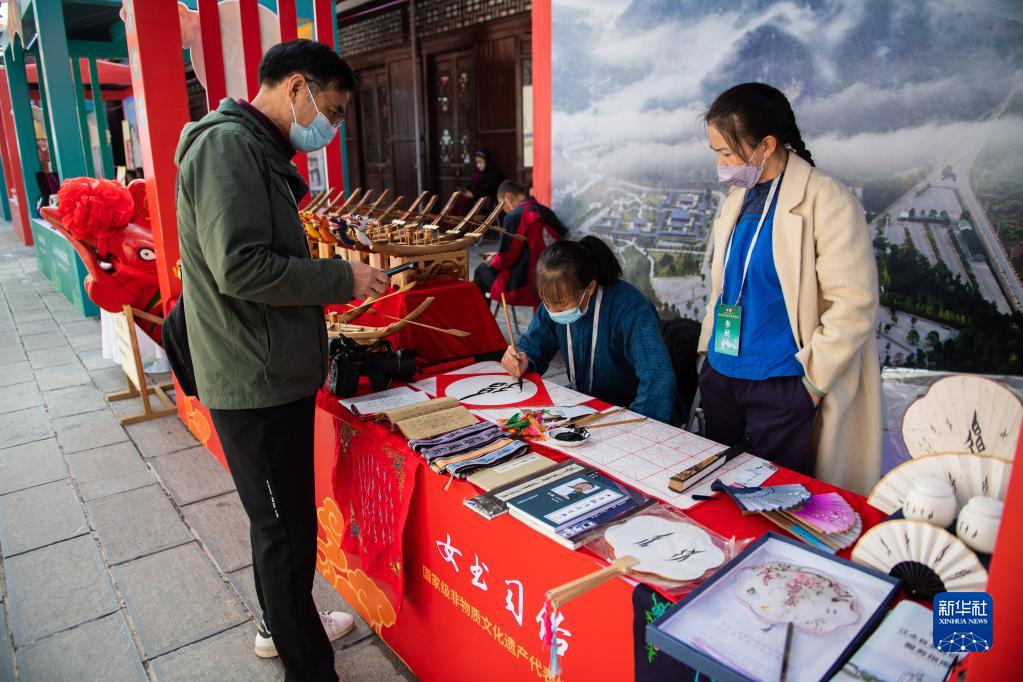 11月19日,非遗传承人在张家界大庸古城湖南首届非遗博览会现场展示女书习俗。