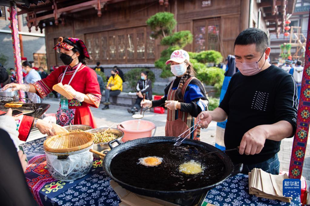 11月19日,工作人员在张家界大庸古城湖南首届非遗博览会现场制作美食。