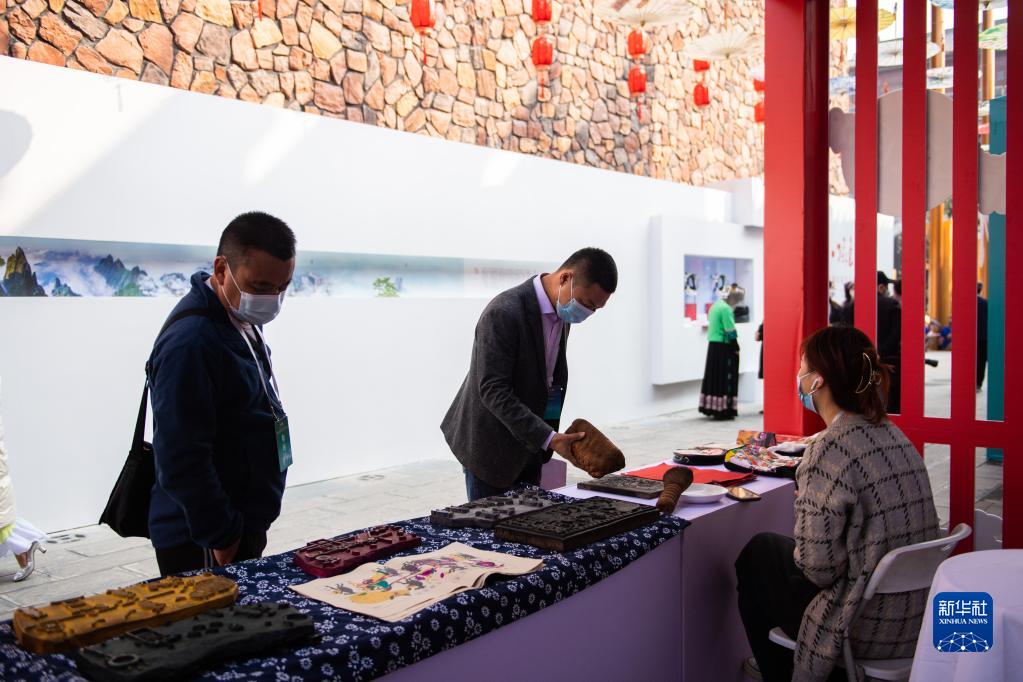 11月19日,游客在张家界大庸古城湖南首届非遗博览会现场挑选非遗商品。