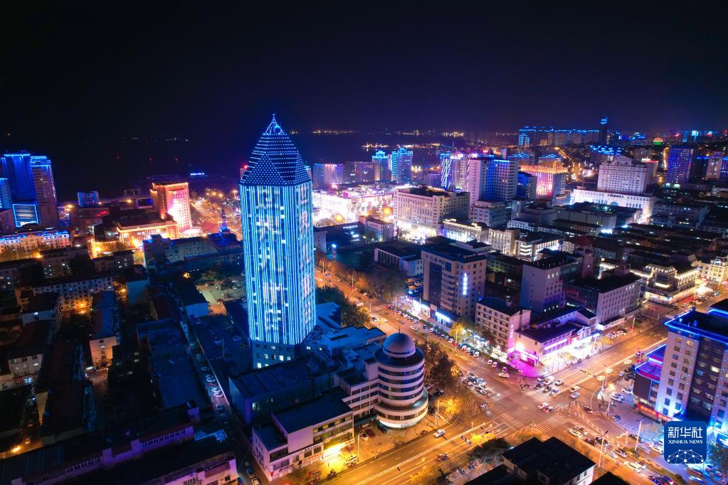 11月20日,山东威海标志性建筑为世界儿童日亮灯。