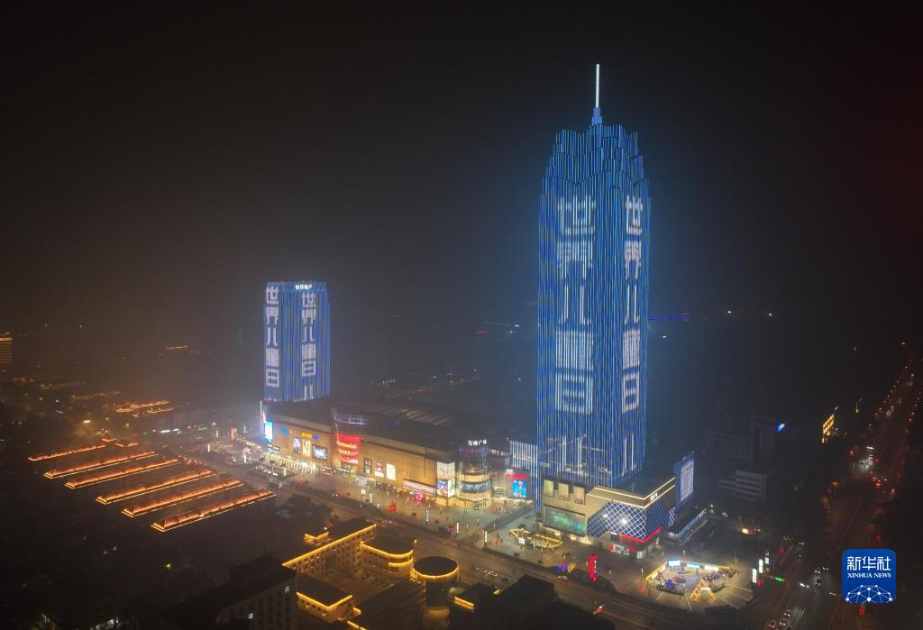 11月20日,河北省保定市万博广场等建筑为世界儿童日亮灯(无人机照片)。