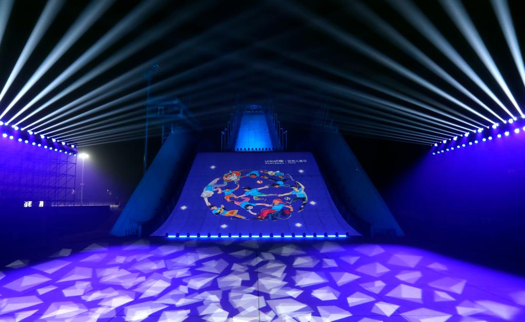 11月20日,北京首钢滑雪大跳台为世界儿童日亮灯。