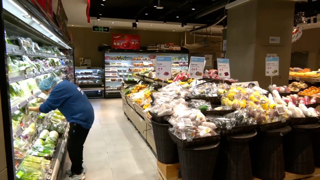在北京某超市货架上,米面粮油、肉禽蛋奶、蔬菜水果等生活必需品物资充盈。受访者供图。