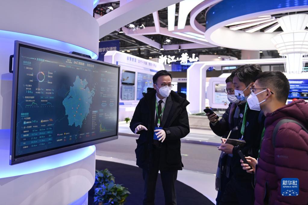 12月19日,工作人员在浙江省交通集团展区向观众介绍“急客通·施救在线”平台。平台创新信息直通、施救直联、路损直赔、车辆直拖四大应用场景,为司乘人员提供施救、维修、理赔等一站式特色服务。