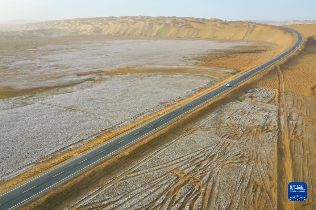 工作车辆在新疆尉犁至且末沙漠公路上行驶(2022年6月26日摄,无人机照片)。2022年6月30日,尉犁至且末沙漠公路正式通车,成为我国建成的第三条穿越“死亡之海”塔克拉玛干沙漠的交通要道。