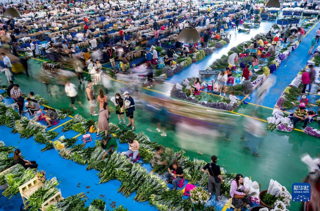 游客在夜间游览云南昆明斗南花卉交易市场并选购鲜花(2022年7月12日摄)。昆明斗南被誉为“亚洲花都”,鲜花远销50多个国家和地区。近年来,作为花卉交易及游览景区的斗南花市根据夜间交易及人流量特点,以花卉消费体验、旅游体验、文化体验为特色大力发展“夜经济”。