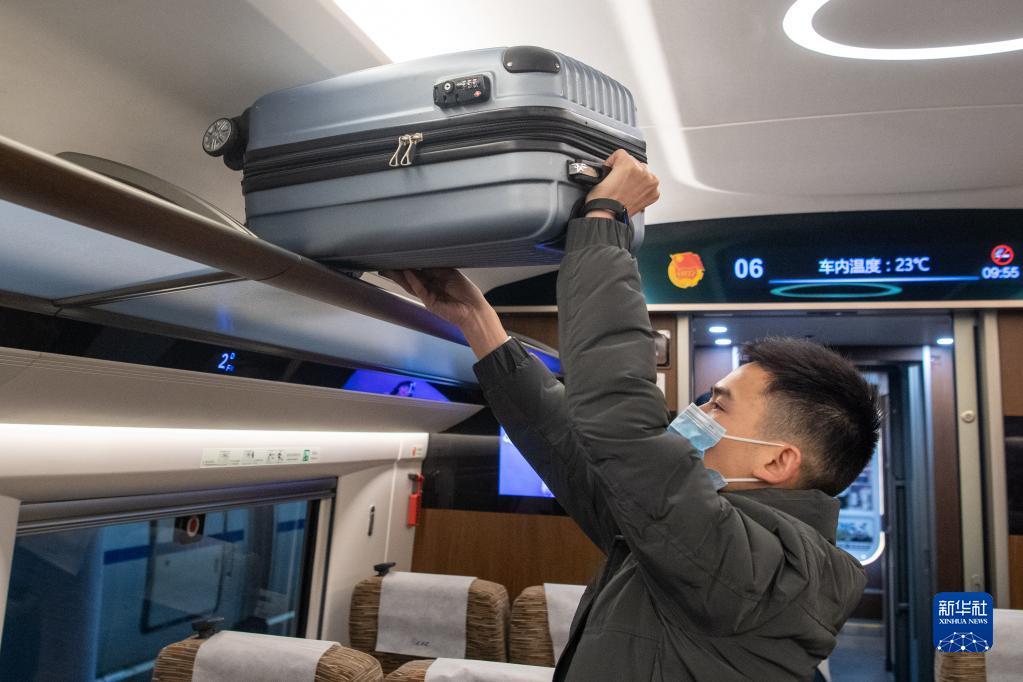 12月27日,在重庆北站即将发车的G8612次成渝城际高铁“复兴号”智能动车组车厢内,乘客整理行李。