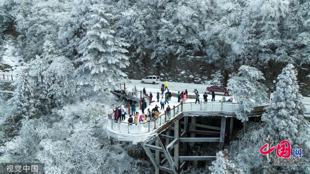 2023年1月16日,江西九江,庐山雪后初霁,银装素裹。大雪过后的庐山雾凇雪凇摇曳生姿,宛若人间仙境,吸引了不少游客前来欣赏雪景。图片作者:魏东升/视觉中国