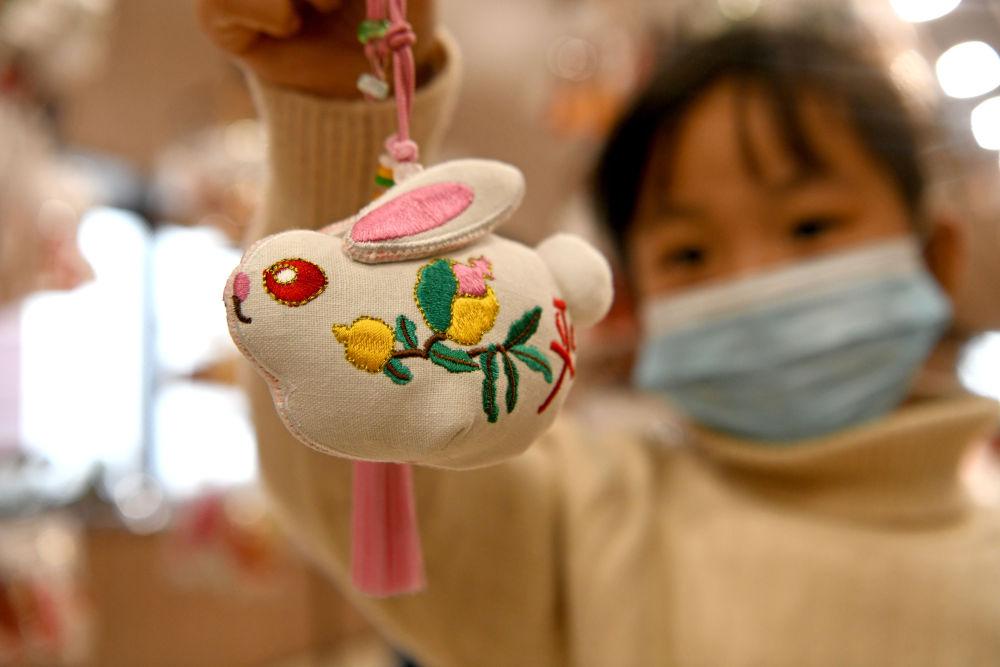 1月19日,安徽省淮南市寿县一名小朋友在安徽楚文化博物馆文创馆内选购生肖兔造型的香包。新华社发(陈彬 摄)