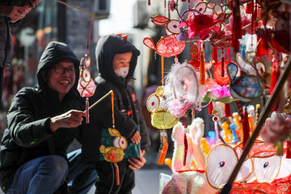 1月20日,市民在江苏扬州东关历史街区购买兔子花灯。新华社发(齐立广 摄)