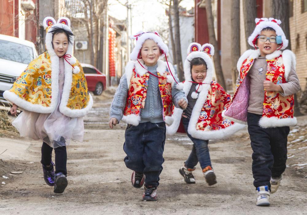 1月19日,在山西省运城市盐湖区乔阳村,孩子们穿戴兔衣、兔帽饰品玩耍。新华社发(姜桦 摄)