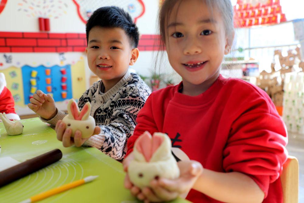 1月20日,在山东省滨州市高新区小营街道新时代文明实践站,小朋友展示和民间艺人一起制作的兔子花馍。新华社发(张春峰 摄)