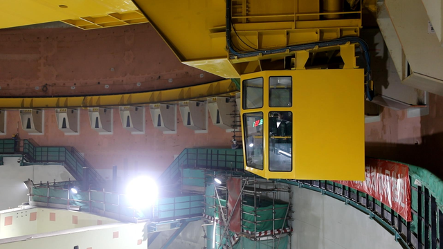 华龙一号里要安装的设备,小的有一两吨,大的能到两三百吨,这些都是靠厂房顶部的一台巨大的环形吊车来进行吊装。它位于反应堆厂房顶部约40米的高处。由于吊车位置太高,出入不便,往返到地面最少需要半个小时,环吊司机蔡凯旋为了提高工作效率,工作期间她不喝一口水,在这个不到2平方米的驾驶室里,一坐就是五六个小时。蔡凯旋告诉记者,在驾驶环吊的过程中最重要的是专注。在她看来,专注起来开环吊是一件非常有意思的事。