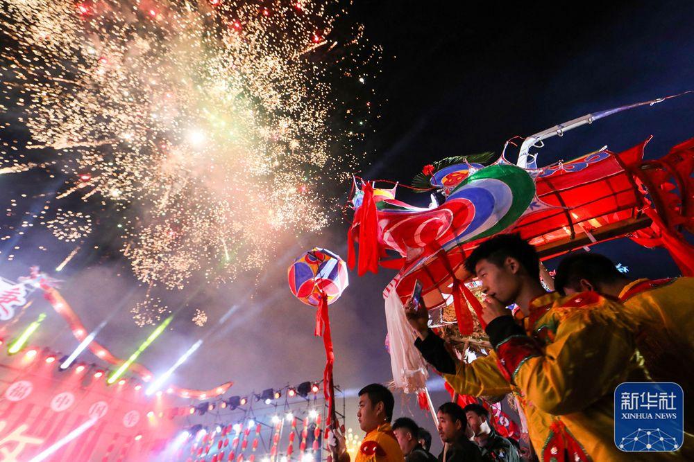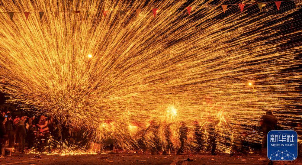 1月30日,民间艺人在贵州省遵义市播州区苟江镇表演“打铁花”。新华社发(罗星汉摄)