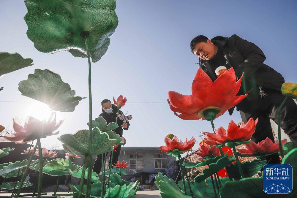 1月31日,河北省遵化市东旧寨镇石桥头村的民间艺人在组装河灯,为元宵佳节增添喜庆氛围。新华社发(刘满仓摄)