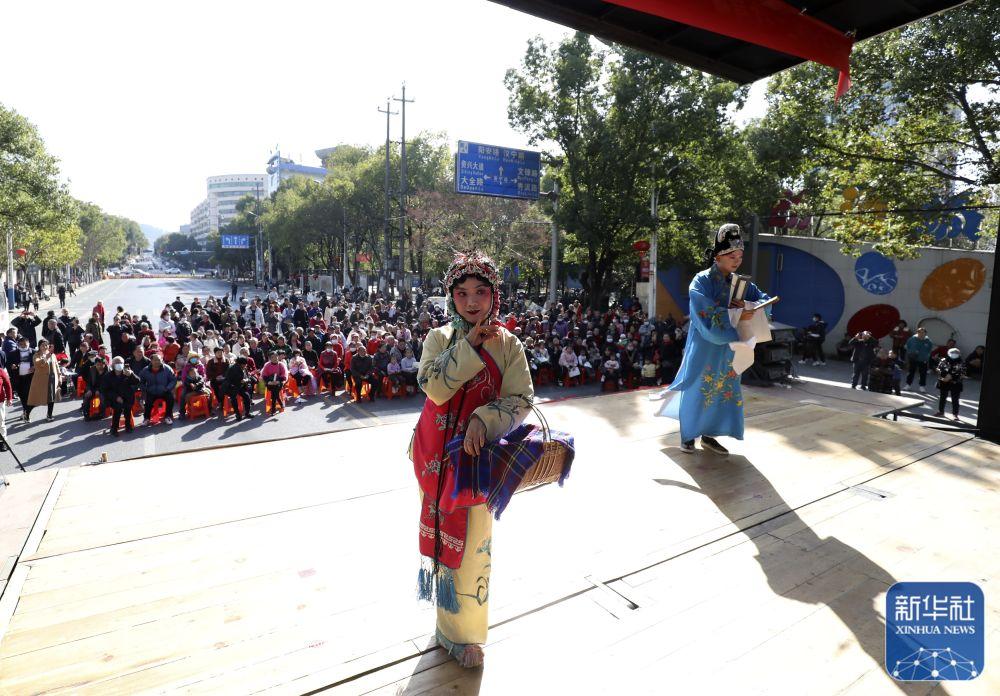 1月30日,在湖南省资兴市人民广场,演员在舞台上进行花鼓戏表演。新华社发(李科摄)