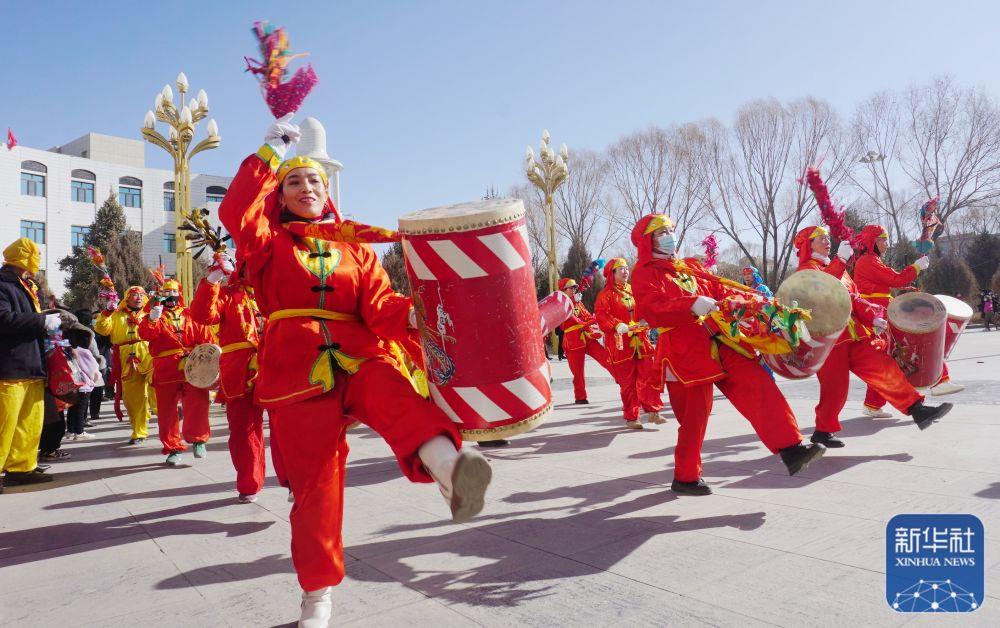 1月30日,甘肃省阿克塞哈萨克族自治县社火队在进行太平鼓表演。新华社发(马晓伟摄)