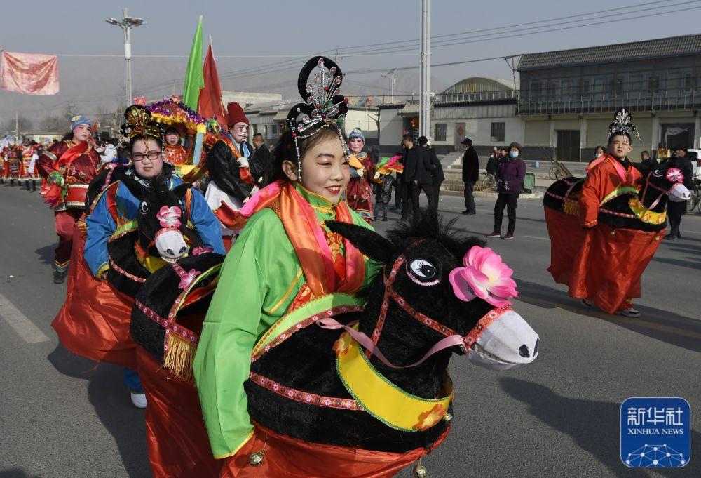 1月30日,在甘肃省临夏回族自治州永靖县太极镇,村民表演社火节目“骑毛驴”。新华社发(史有东摄)