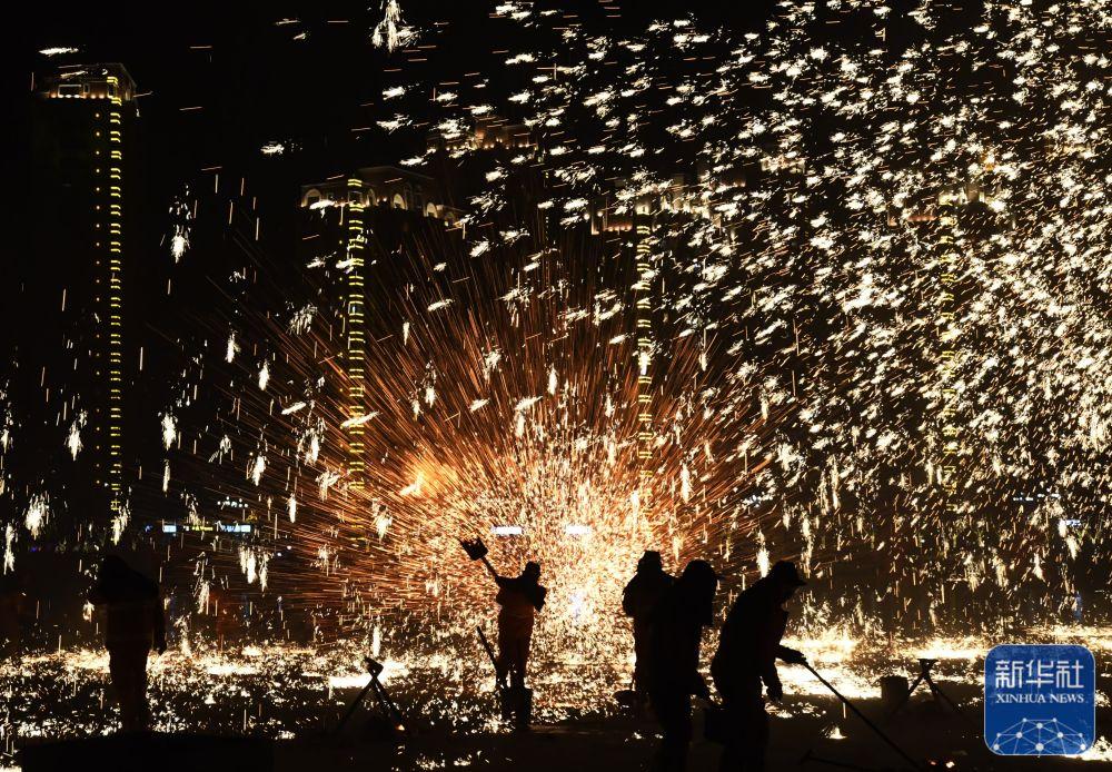 1月29日,艺人在甘肃省临夏回族自治州永靖县刘家峡镇郁金香广场表演“打铁花”。新华社发(史有东摄)