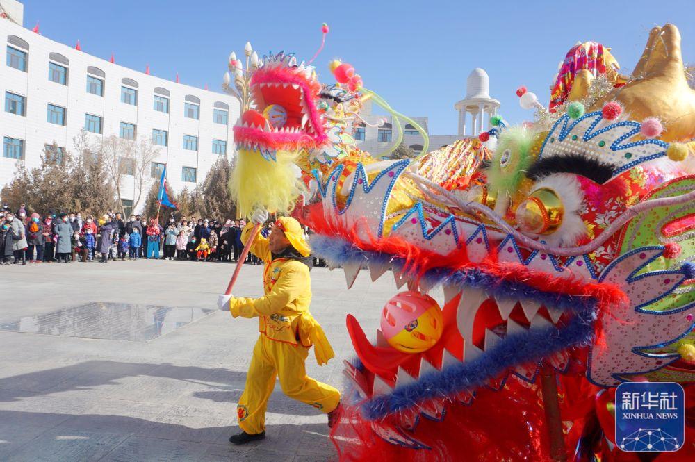 1月30日,甘肃省阿克塞哈萨克族自治县社火队在进行舞龙表演。新华社发(马晓伟摄)