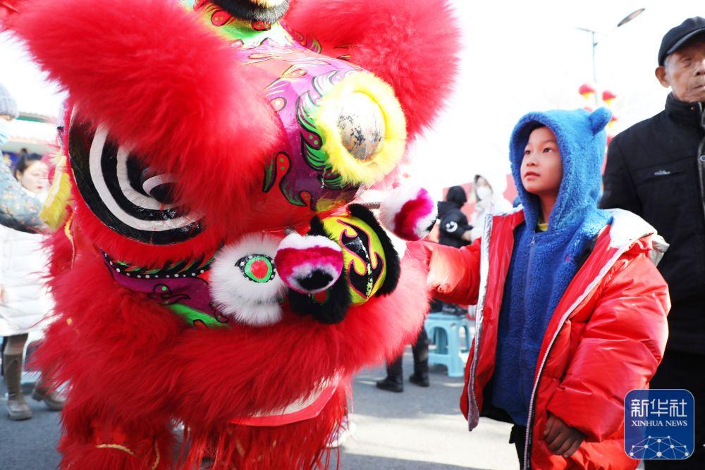 1月30日,在河北省唐山市丰润区沙流河镇皇亲庄村,小朋友被舞狮表演吸引。新华社发(朱大勇摄)