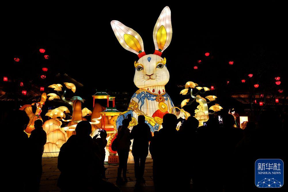 1月30日,在山东省枣庄市台儿庄古城,游人在欣赏以“兔”元素为主题的花灯。新华社发(孙中喆摄)