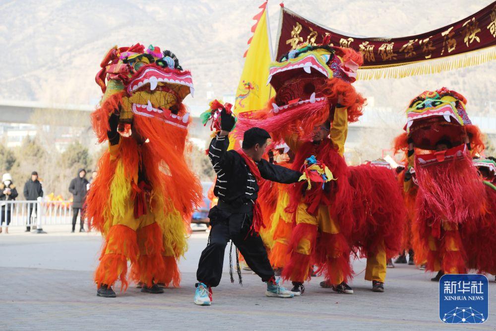 1月31日,甘肃省定西市安定区凤翔镇的社火队员在表演舞狮。 新华社发(王克贤摄)