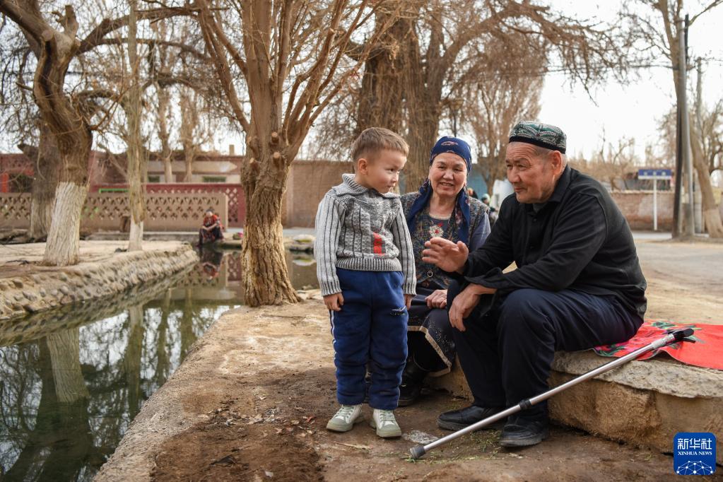 在新疆吐鲁番市高昌区恰特喀勒乡拜什巴拉坎儿孜村,73岁的老人斯肯旦·卡德尔(右)给孙子讲述着自己小时候修坎儿井的故事(3月7日摄)。