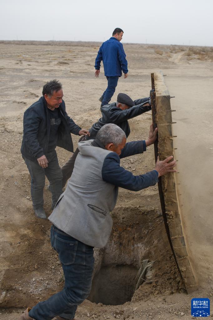 在新疆吐鲁番市高昌区艾丁湖镇附近的戈壁滩,花园村掏捞队的队员打开坎儿井竖井盖板,准备清理淤泥(3月9日摄)。