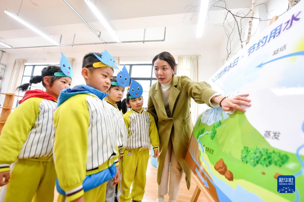 3月21日,浙江省湖州市长兴县龙山幼儿园的教师为孩子们讲解水循环知识。